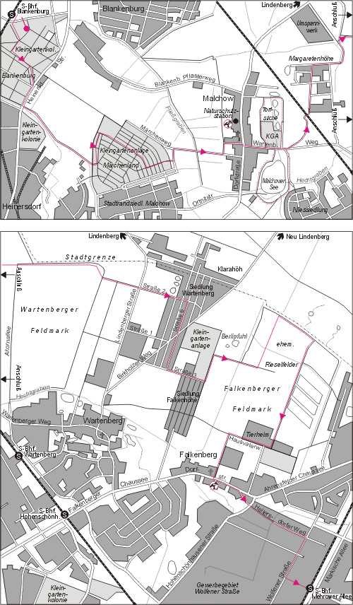 In Berlin gab es in den vergangenen Jahren zwei besetzte Storchennester, eines in Malchow, das andere in Falkenberg. Wir haben gemeinsam mit Waltraut und Helmut Zoels (NABU Berlin) eine Fahrradroute zusammengestellt, die auf kleinen Wegen zu den beiden Nestern führt. Ausgangspunkt ist der S-Bahnhof Blankenburg, Ziel der S-Bahnhof Mehrower Allee. Entlang der Strecke liegen weitere Sehenswürdigkeiten, so die Kleingartenkolonie Märchenland (sehr hohe Vogeldichte u.a. Nachtigallen), das Dorf Malchow mit der Naturschutzstation und dem Friedhof mit der Kirchenruine, die Torfstiche nördlich des Wartenberger Weges und der Malchower See (Bademöglichkeit) südlich davon und schließlich die Falkenberger Feldmark mit alten Haustierrassen.